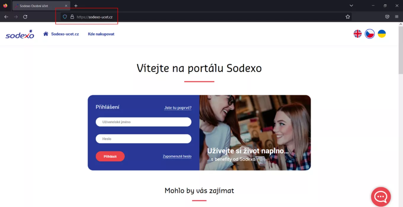 Při přihlašování k účtu Pluxee se vždy ujistěte, že adresa obsahuje HTTPS protokol pro zabezpečenou komunikaci - https://ucet.pluxee.cz.